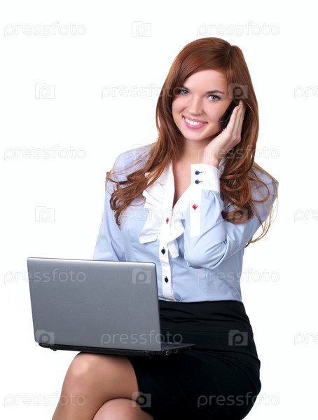 Деловая женщина с ноутбуком говорит по телефону