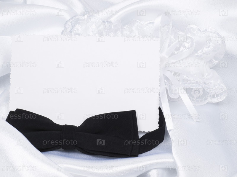 Карточка, свадебная подвязка и бабочка на фоне белого шелка