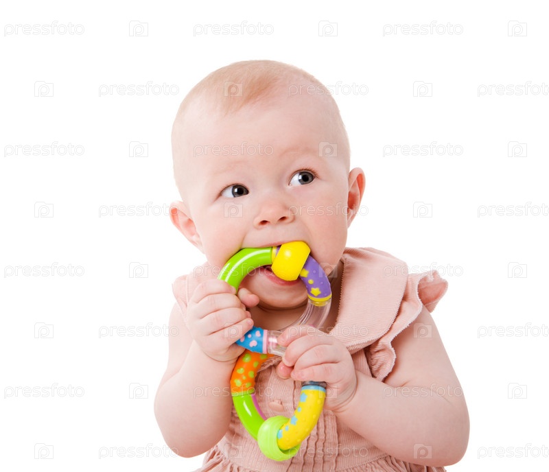 Маленькая девочка, грызущая игрушку на белом фоне