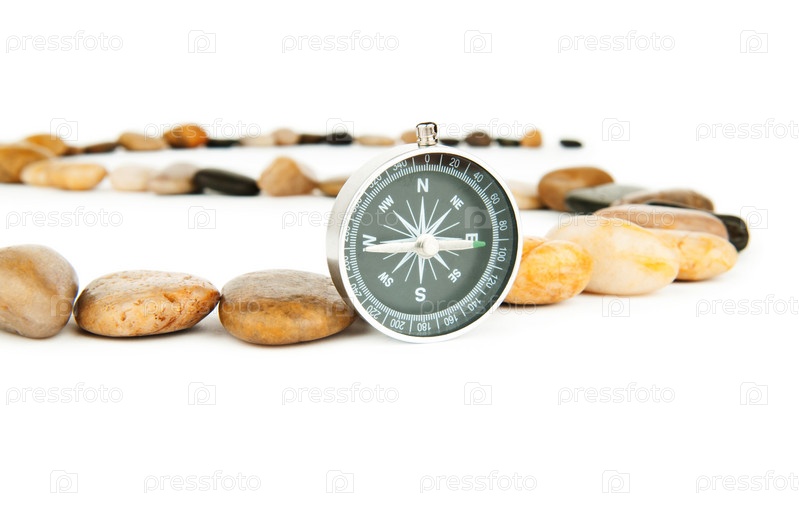 Морская галька и компас на белом фоне