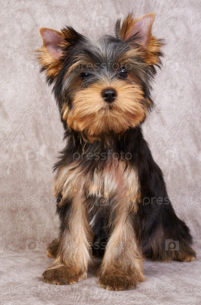 Щенок йоркширского терьера на сером фоне