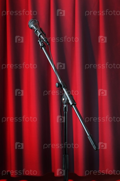 Аудиомикрофон крупным планом на фоне красного занавеса