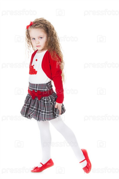 Симпатичная девочка с длинными кудрявыми волосами на белом фоне