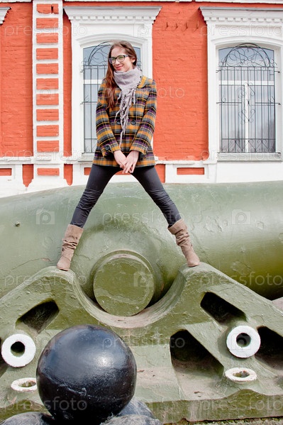 Симпатичная девушка позирует у музея военной техники
