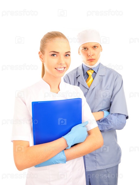 Молодой врач и его помощница на белом фоне
