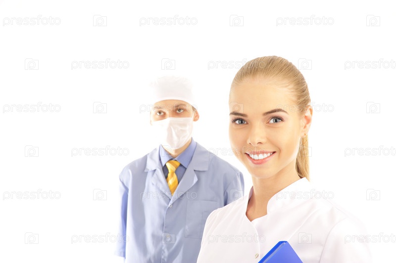 Молодой врач и его помощница на белом фоне