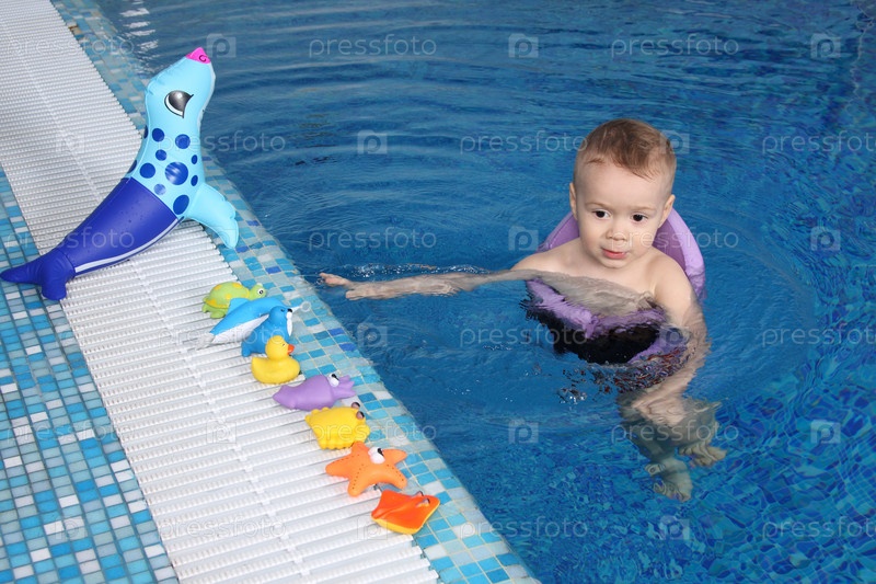 Маленький мальчик купается в бассейне