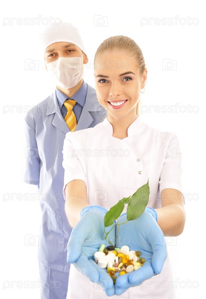 Молодой врач и медсестра с таблетками и растением в руках