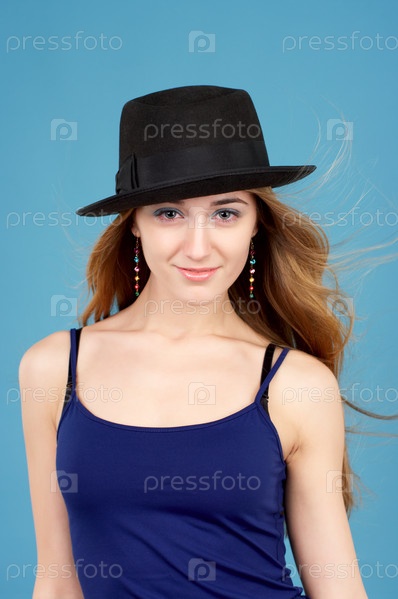 Девушка в шляпе на голубом фоне