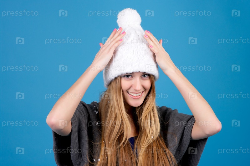 Девушка отряхивает снег с зимней шапки