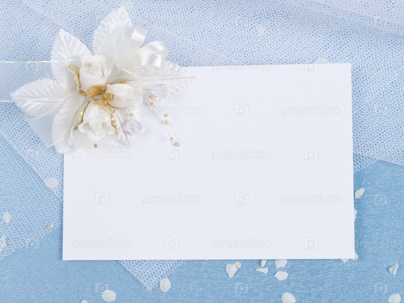 Белая карточка и бутоньерка на голубом фоне для свадебного поздравления