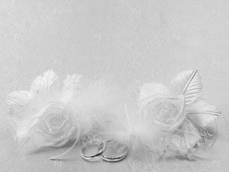 Обручальные кольца и бутоньерки на белом фоне