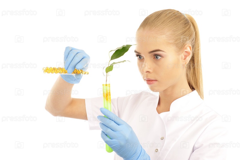 Молодая медсестра, пересыпающая лекарство в колбу с растением