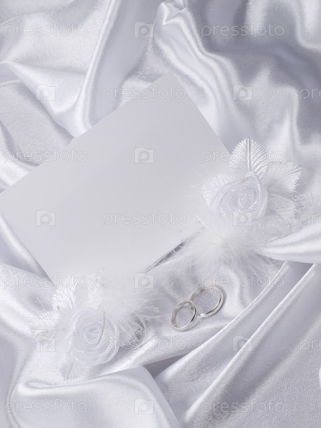 Белая карточка для поздравления с обручальными кольцами на белом шелке
