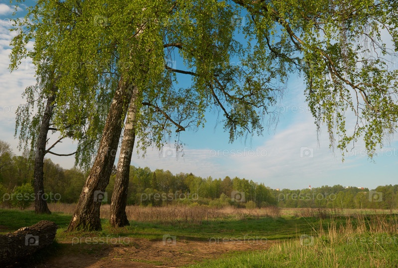 Березовый лес и поле в солнечный летний день