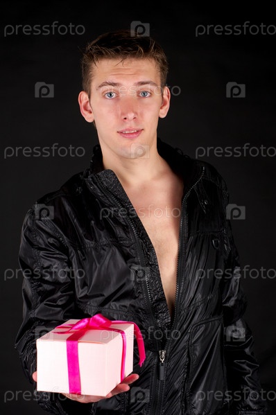 Молодой человек с подарком, на черном фоне