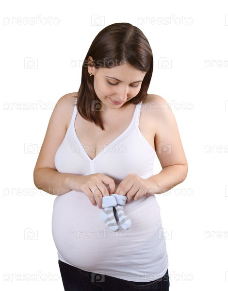 Беременная женщина с носками для малыша на белом фоне