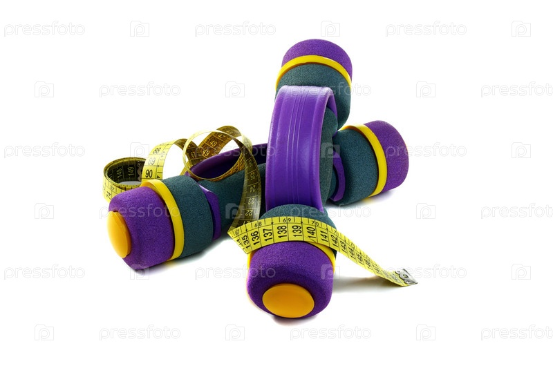 Цветные гантели и измерительная лента, изолированы на белом фоне