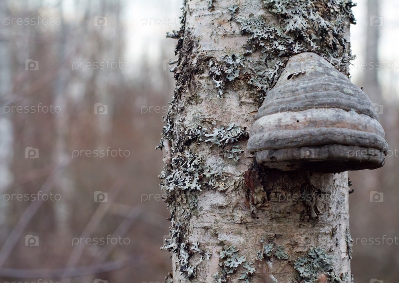 Гриб чага на стволе дерева