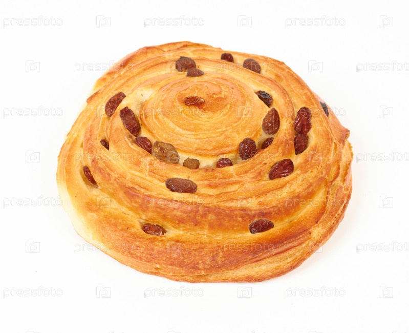 Свежая булочка с изюмом на белом фоне