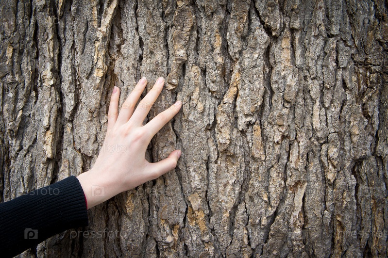 Женская рука на стволе дерева крупным планом