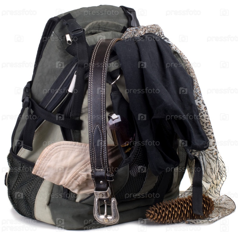 Рюкзак с вещами на белом фоне
