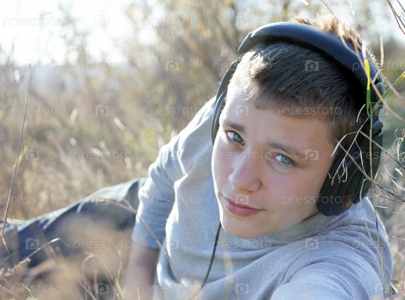 Мальчик слушает музыку в наушниках, лежа в траве осенним днем