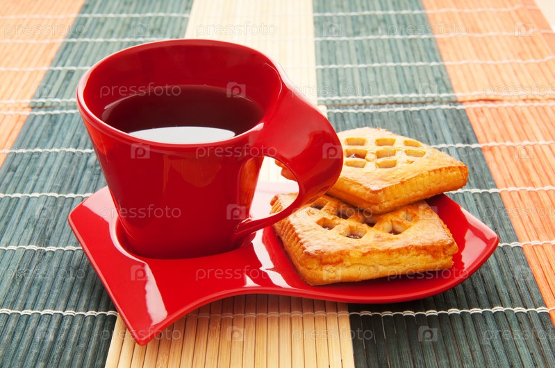 Красная чашка кофе и печенье на бамбуковой скатерти