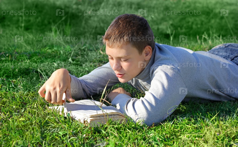 Мальчик с книгой на зеленой траве