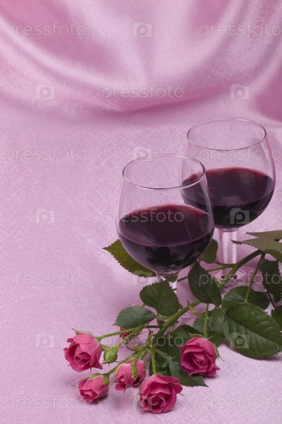 Розы и два бокала с вином на розовом фоне