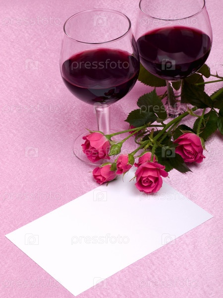 Розы и два бокала с вином на розовом фоне