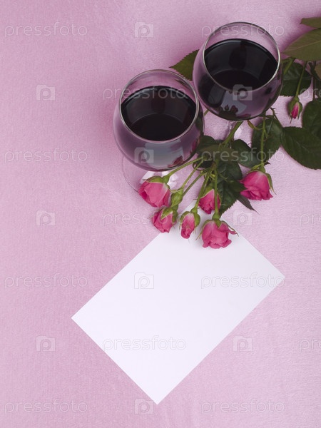 Розы и два бокала с вином на розовом фоне