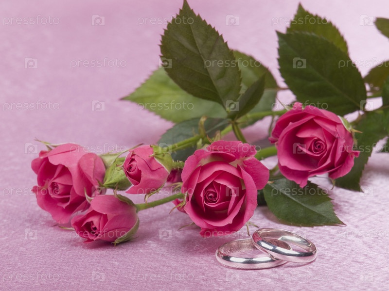 Розы и обручальные кольца на розовом фоне