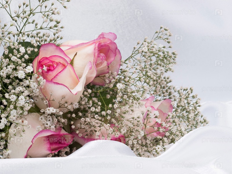 Красивый букет из роз на фоне белого шелка