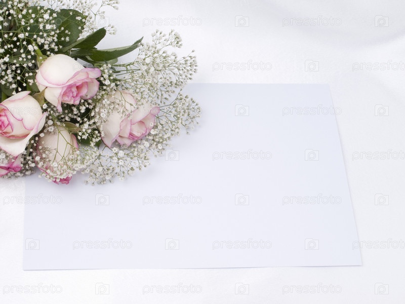 Красивый букет из роз и пустой лист бумаги на фоне белого шелка