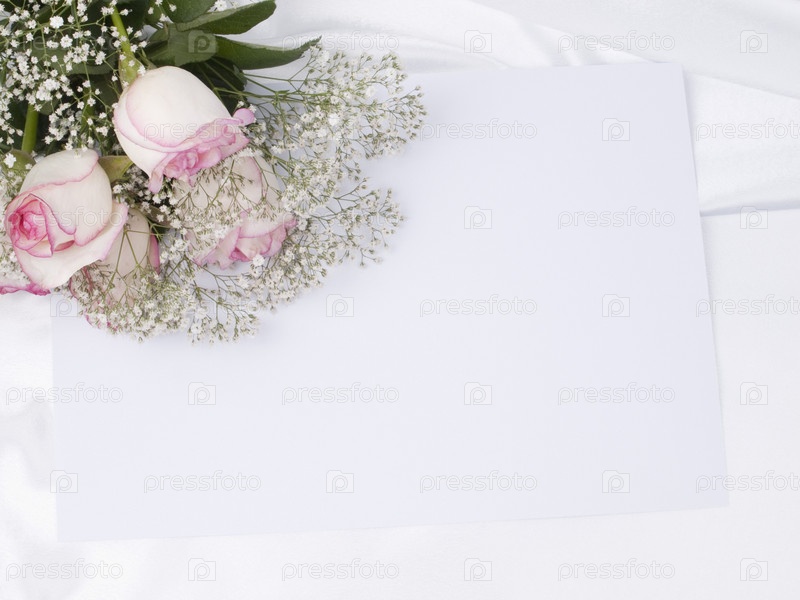 Красивый букет из роз и пустой лист бумаги на фоне белого шелка