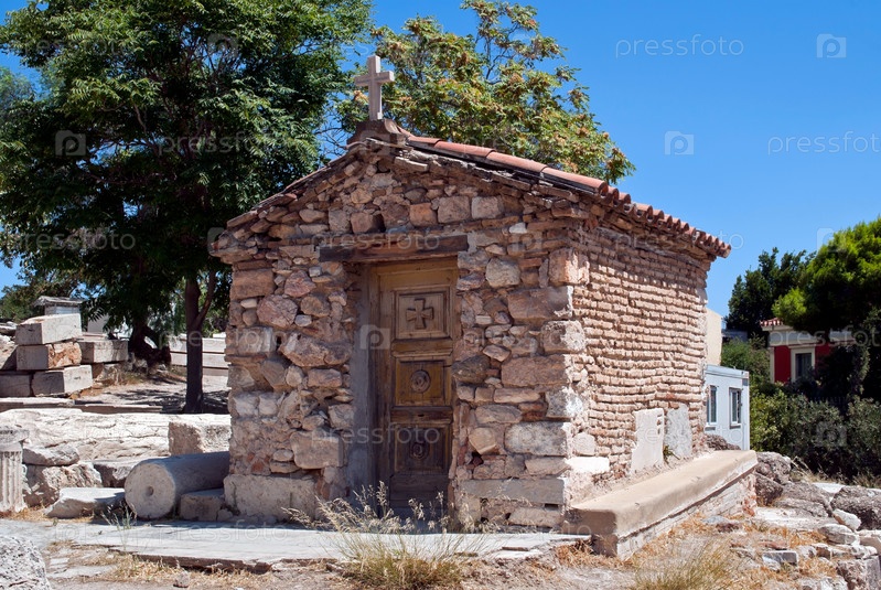 Античная греческая часовня с резной деревянной дверью на территории Акрополя в Афинах