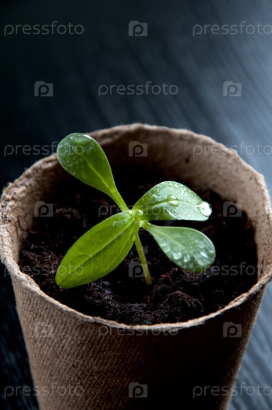Зеленый саженец в торфяном горшочке крупным планом