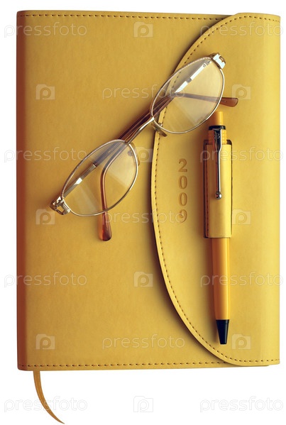 Желтый органайзер, очки и ручка, на белом фоне