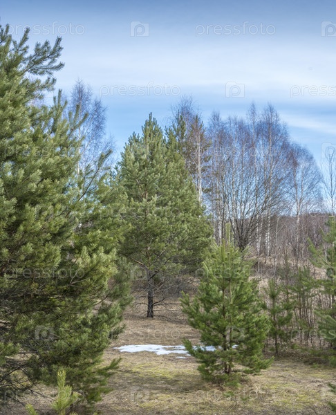 Среди зеленых сосен виднеются остатки снега. Солнечный, весенний день