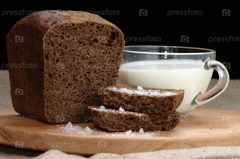 Ржаной хлеб с солью и стеклянная чашка молока