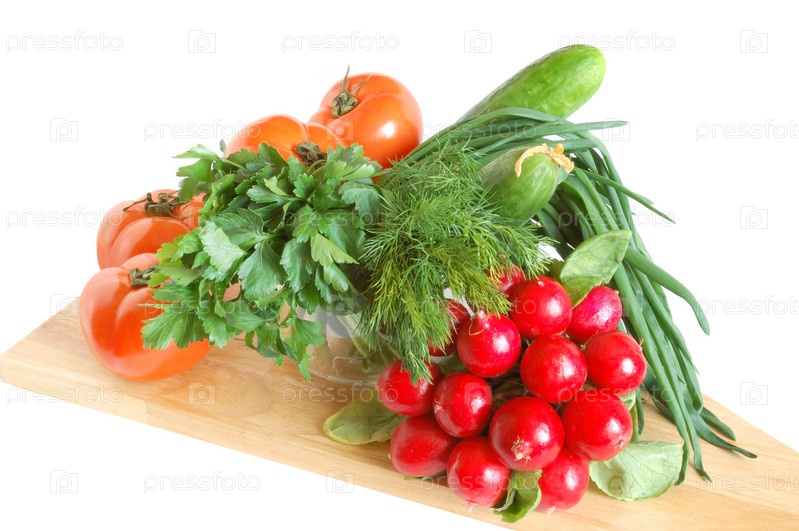 Огурцы, помидоры, редис и зелень на разделочной доске