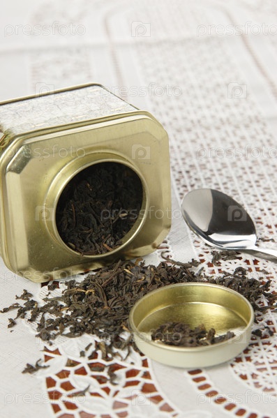 Сухой чай в металлической банке на кружевной салфетке