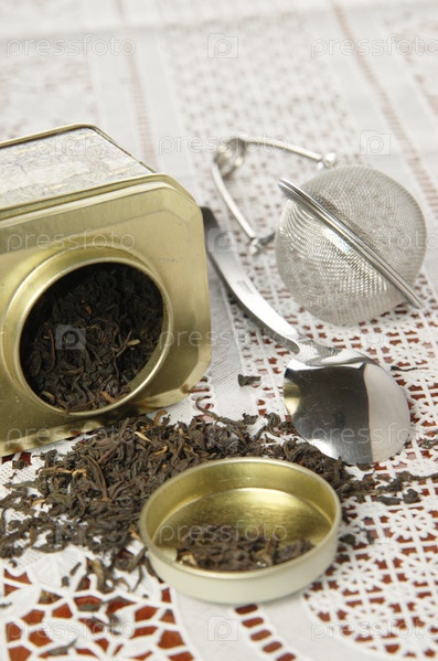 Сухой чай в металлической банке, ложка и ситечко