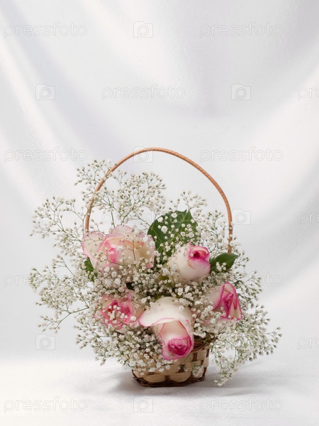 Красивый букет роз на фоне белого шелка