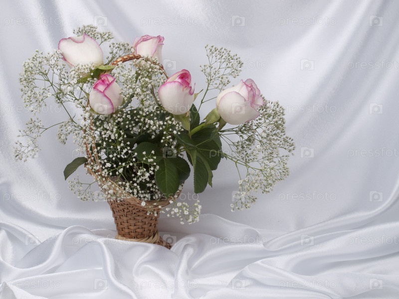 Красивый букет роз на фоне белого шелка