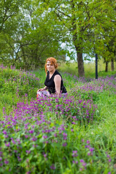Рыжеволосая девушка позирует на свежем воздухе