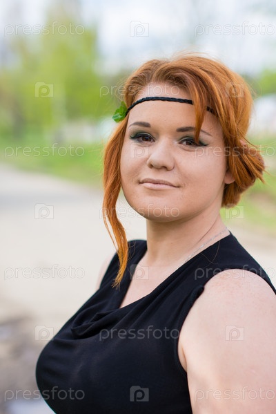 Рыжеволосая девушка позирует на свежем воздухе