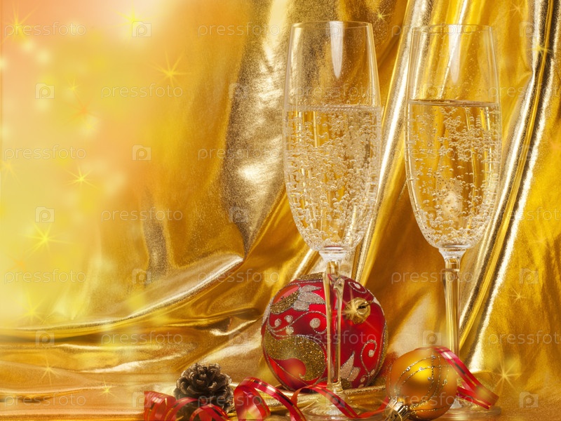 Новогодние шары и два бокала с шампанским на золотом фоне