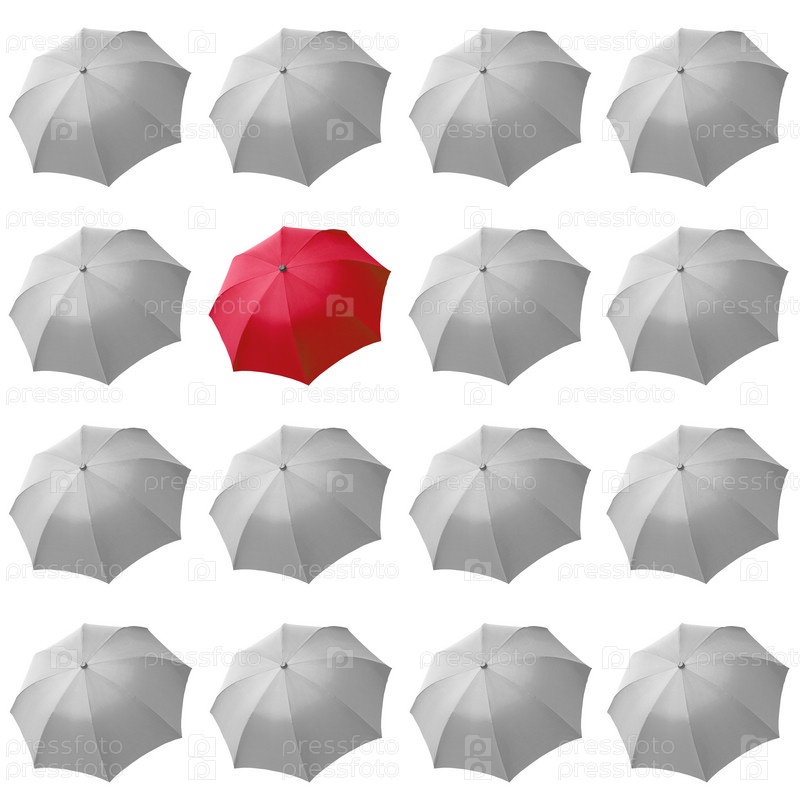 Один красный зонт среди белых